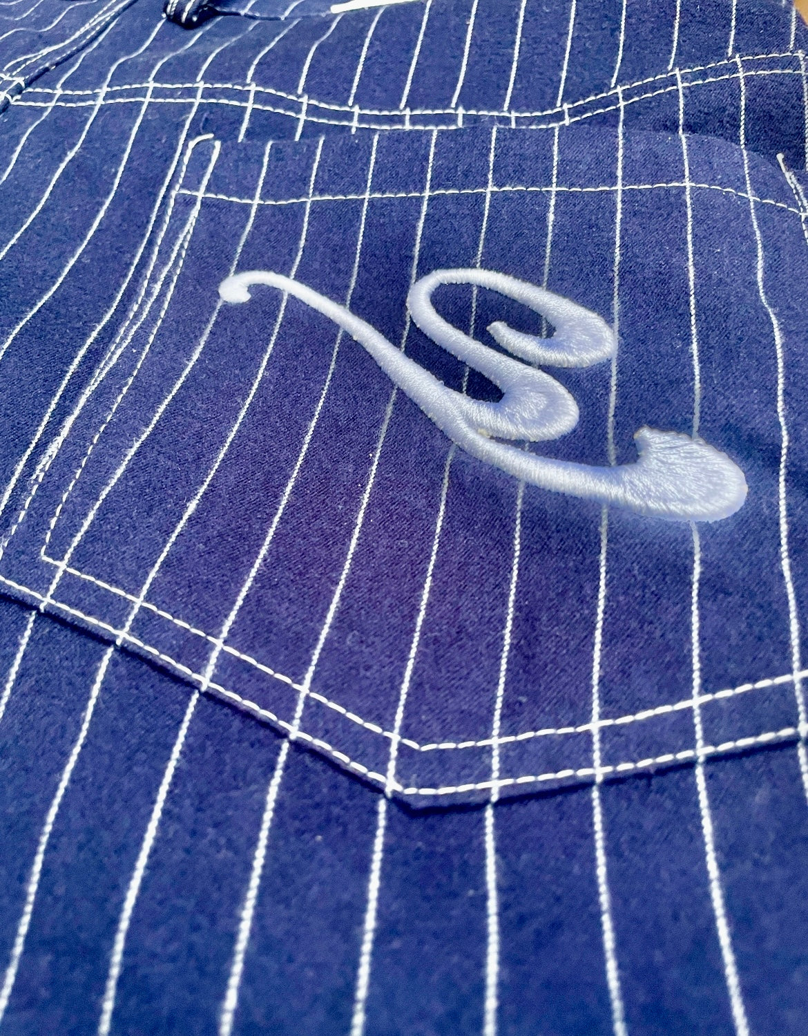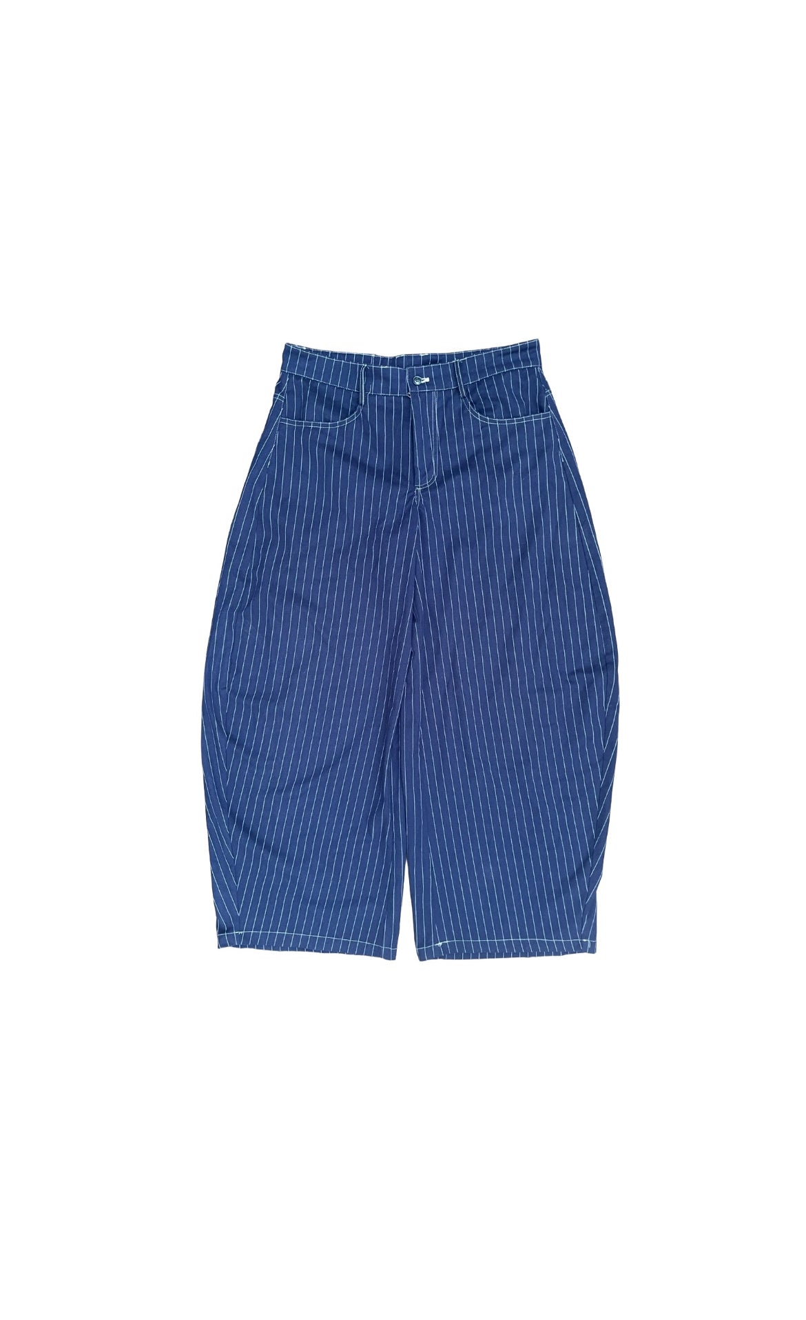 Our Navy Striped Pants in a relaxed wide leg cut. An elevated take on oversized bottoms. These pants bring pinstripe tailoring into the baggy streetwear silhouette.